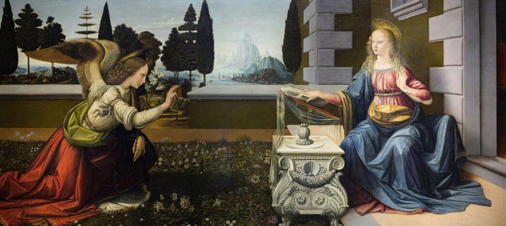 You may know the Leonardo da Vinci painting of the Annunciation that Wilde saw in the Uffizi Gallery, and that he would later describe in his poem “Ave Maria, Gratia Plena.” Angel and Virgin are in classic Annunciation pose. Mary is seated at a lectern; the angel, with his mighty wings, kneels before her in obeisance. The angel is strikingly earthly (he even has a shadow). Mary seems to be, unexpectedly, the essence of calm.