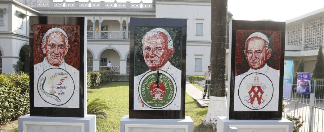 Mosaics of Pope Francis, St. John Paul II, and St. Paul VI are pictured on the grounds of the cathedral in Dhaka, Bangladesh, in this file photo from Dec. 1, 2017. (CNS photo/Paul Haring)