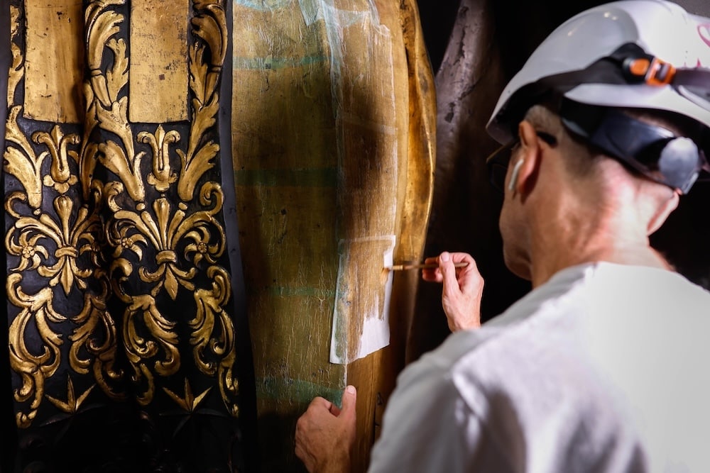 Journalists were given a sneak peek at the restoration Oct. 8, revealing a vivid display of gold that had been hidden behind layers of dust and grime, which had accumulated on its ornate decorations for more than 260 years.