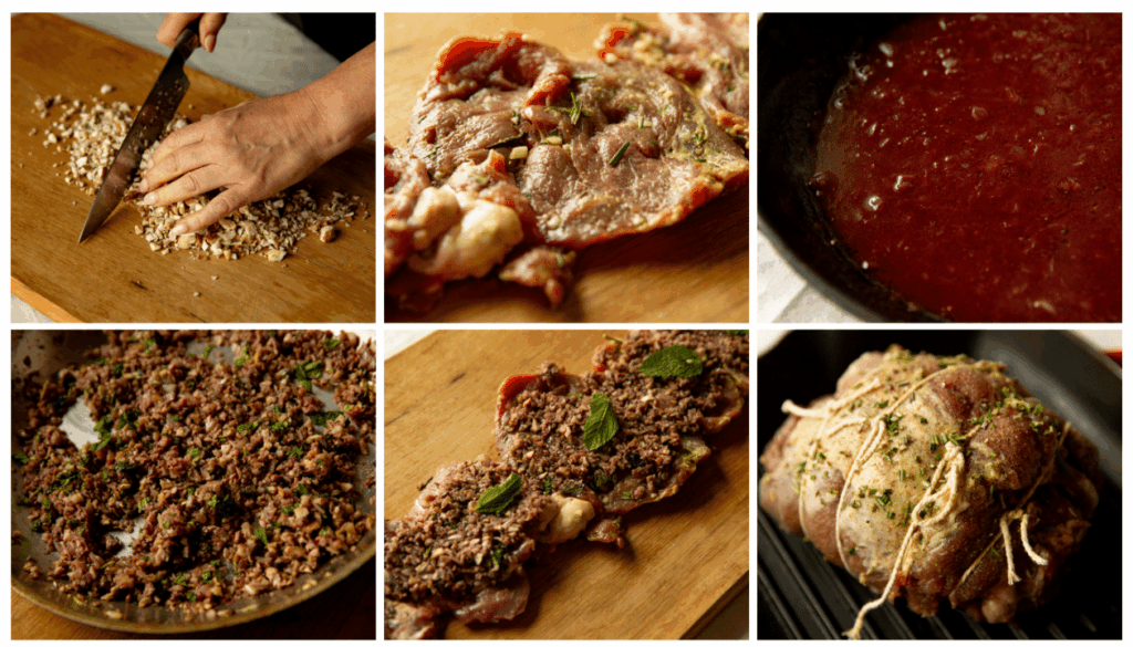 To assemble: Unfurl the meat and spread a layer of stuffing along its surface, leaving a bit of space along the edges. Roll and tie with kitchen string. Roast for 30 minutes at 425 F, then turn the heat down to 350 and continue cooking until the internal temperature reaches 140, about 30 more minutes. Rest for 30 minutes before slicing, and serve with additional red wine sauce and mint for garnish.