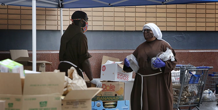 Volunteers soon join the young women religious in setting up stations where people can drive or walk up to receive several boxes of food each week.