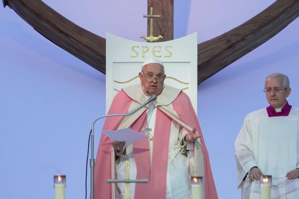 While the sun fell over the sea, casting golden rays on the Corsican hills, the pope, vested in pink for Gaudete Sunday — the third Sunday of Advent — said that Christians must develop a “joyful expectation” for the coming of the Lord rather than fall into an attitude of “suspicion.”